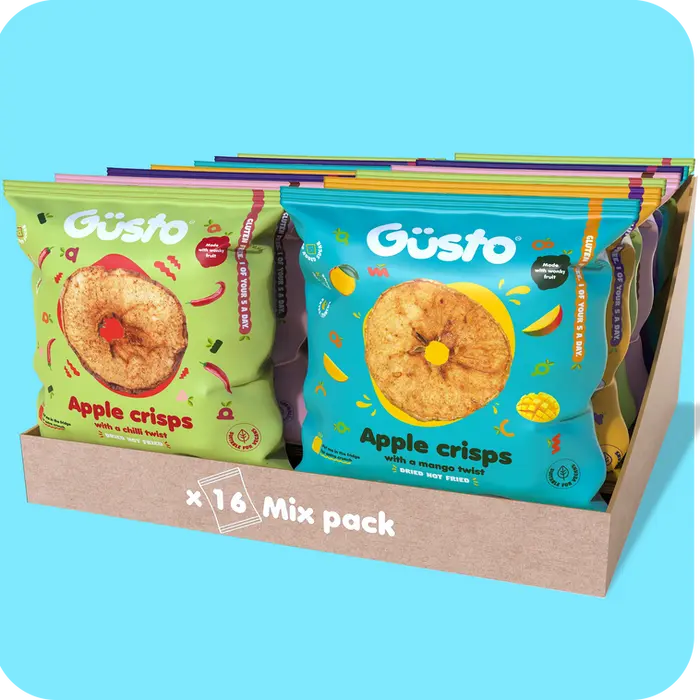 Gusto Snacks are air-dried apple crisps made from "wonky" (or imperfect) fruit that would otherwise be wasted, offering a sustainable and delicious snack alternative. They are known for their unique flavors and are vegan, gluten-free, and contain no added sugar.